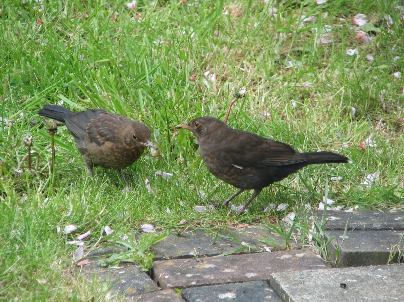 The mother is on the right (yes, she is a blackbird; female blackbirds are brown with yellowish spots), while the chick is on the left and appears to have a slug in its mouth. It was not sure what to do with its prey, so the mother fed the slug to the chick herself; in the following image the mother can be seen taking the slug: